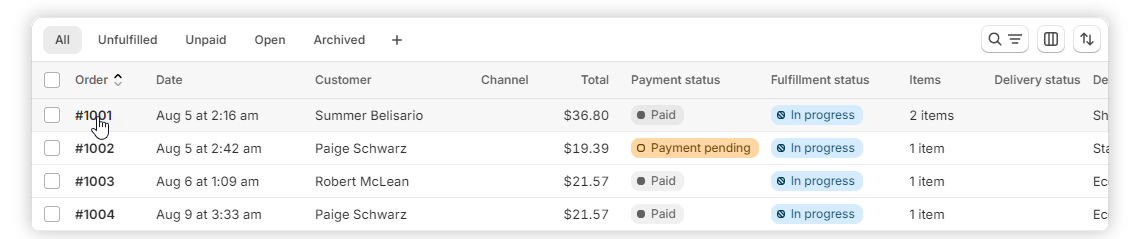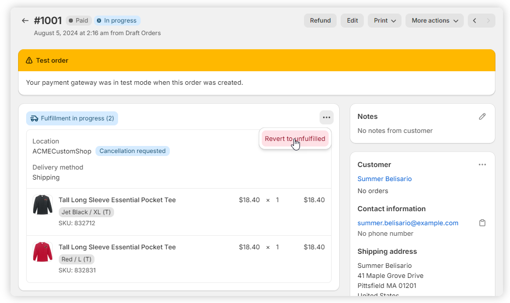 Once you confirm the cancellation, the order status will be updated. The tags "Canceled", "Refunded", "Unfulfilled", and "Archived" will be applied to the order.