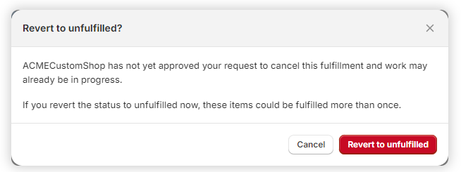 After sending the cancellation request, you can either immediately revert the fulfillment status to "Unfulfilled" and cancel the order, or wait for the cancellation request to be accepted by Visual Ink before canceling the order.