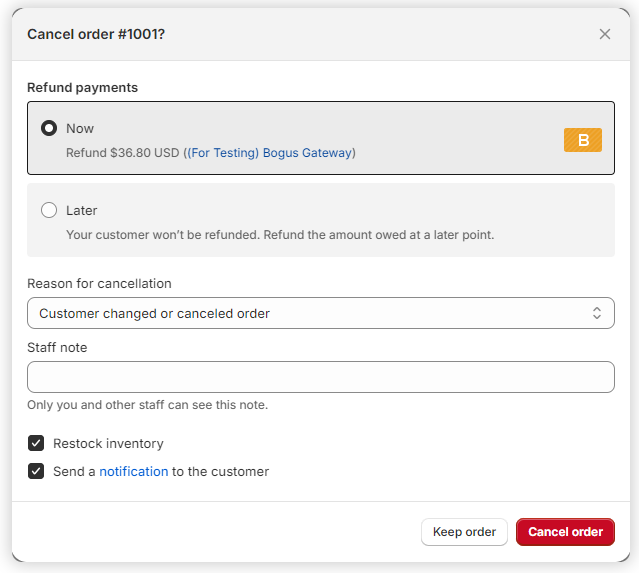 You will be prompted to confirm the cancellation. At this stage, you can issue a refund if the order was paid, adjust the inventory settings, provide a reason for the cancellation, and choose whether to notify the customer.