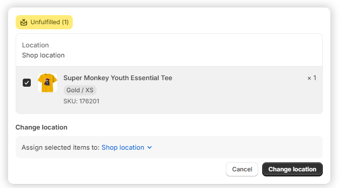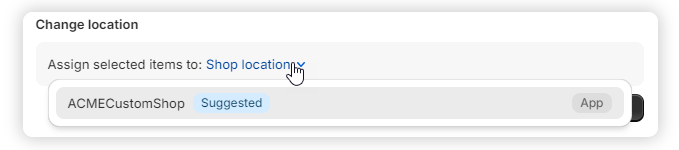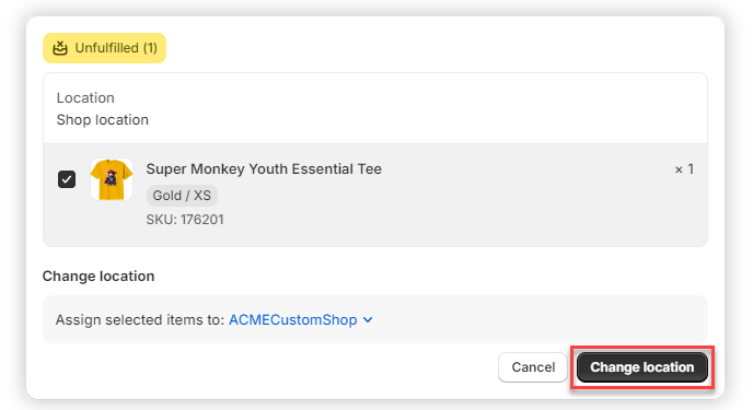 5. Click on the current location after "Assign selected items to:" and Select the Fulfillment Center ie., Visual Ink.