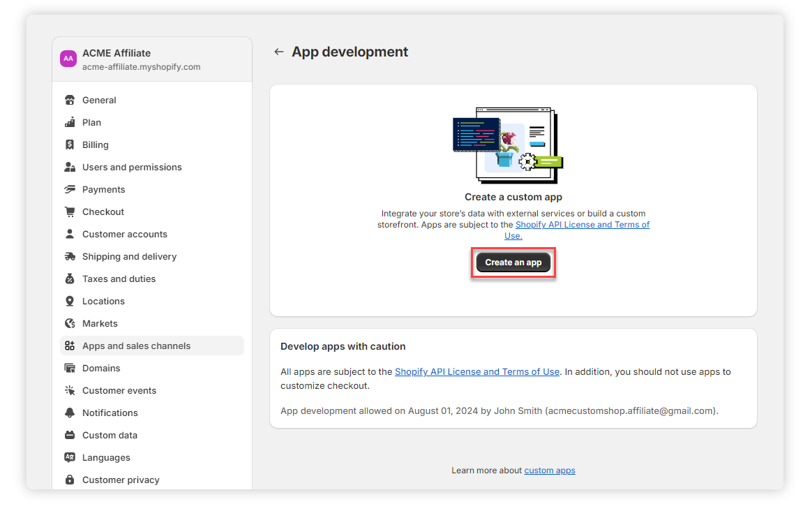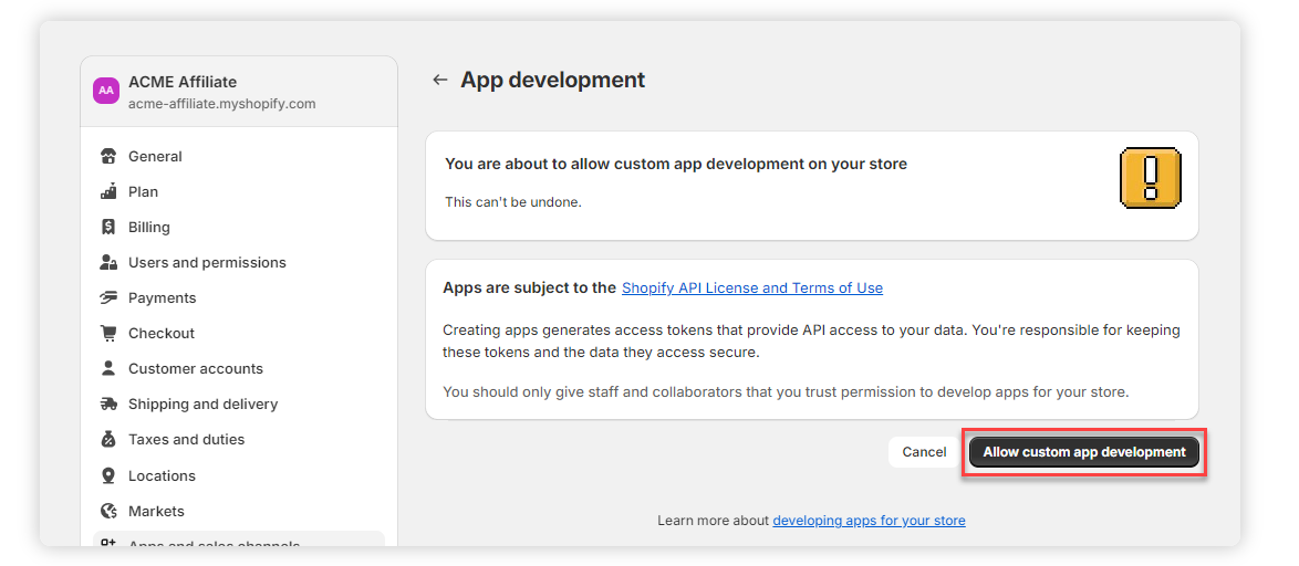 6. Read the warning and information provided. Confirm by clicking Allow custom app development.