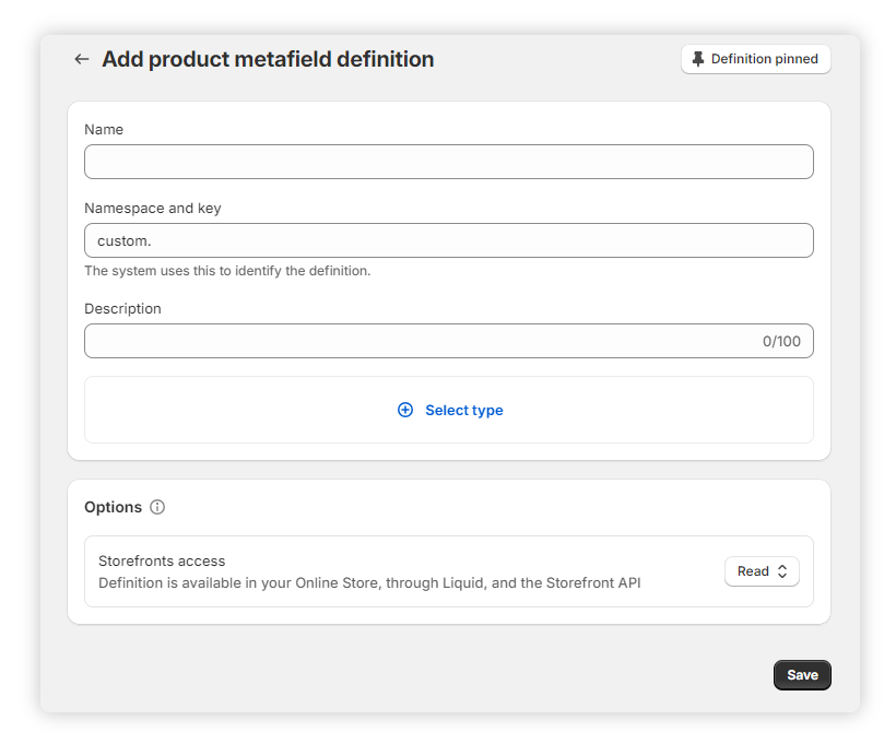Specify a unique namespace and key for your metafield, such as front.decoration_file. This helps in identifying and accessing the metafield later. Shopify will suggest after you have entered a name. You can use the suggested namespace and key if you like.