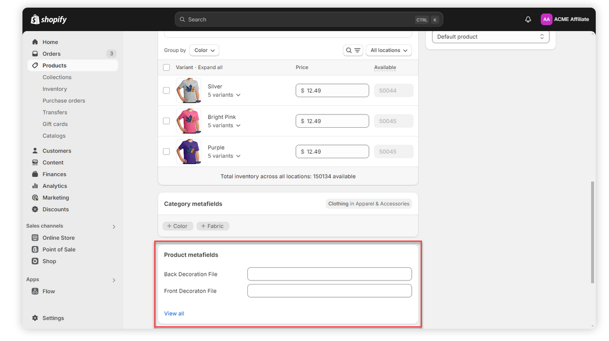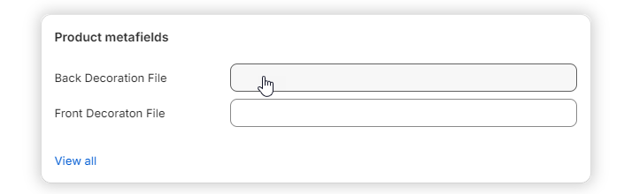 When setting up products in Shopify for fulfillment, it’s essential to configure metafile information that stores the design files used in production. These file metafields enable your designs in Shopify to be automatically matched to the correct decoration areas—namely the front and back—of the blank. Proper product configuration is crucial for smooth fulfillment.
